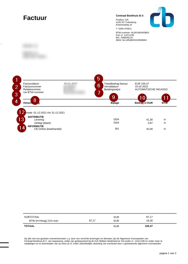 Hieronder vind je een voorbeeld van een standaardfactuur, met toelichting. Klik op de afbeelding om een grotere versie van de factuur te bekijken. De nummering verwijst naar de uitleg in de tabel onder de afbeelding.